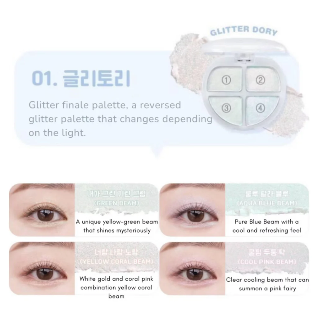 - #01 Glitter Dory: An all-glitter palette with green, coral, blue and pink glitter shades.